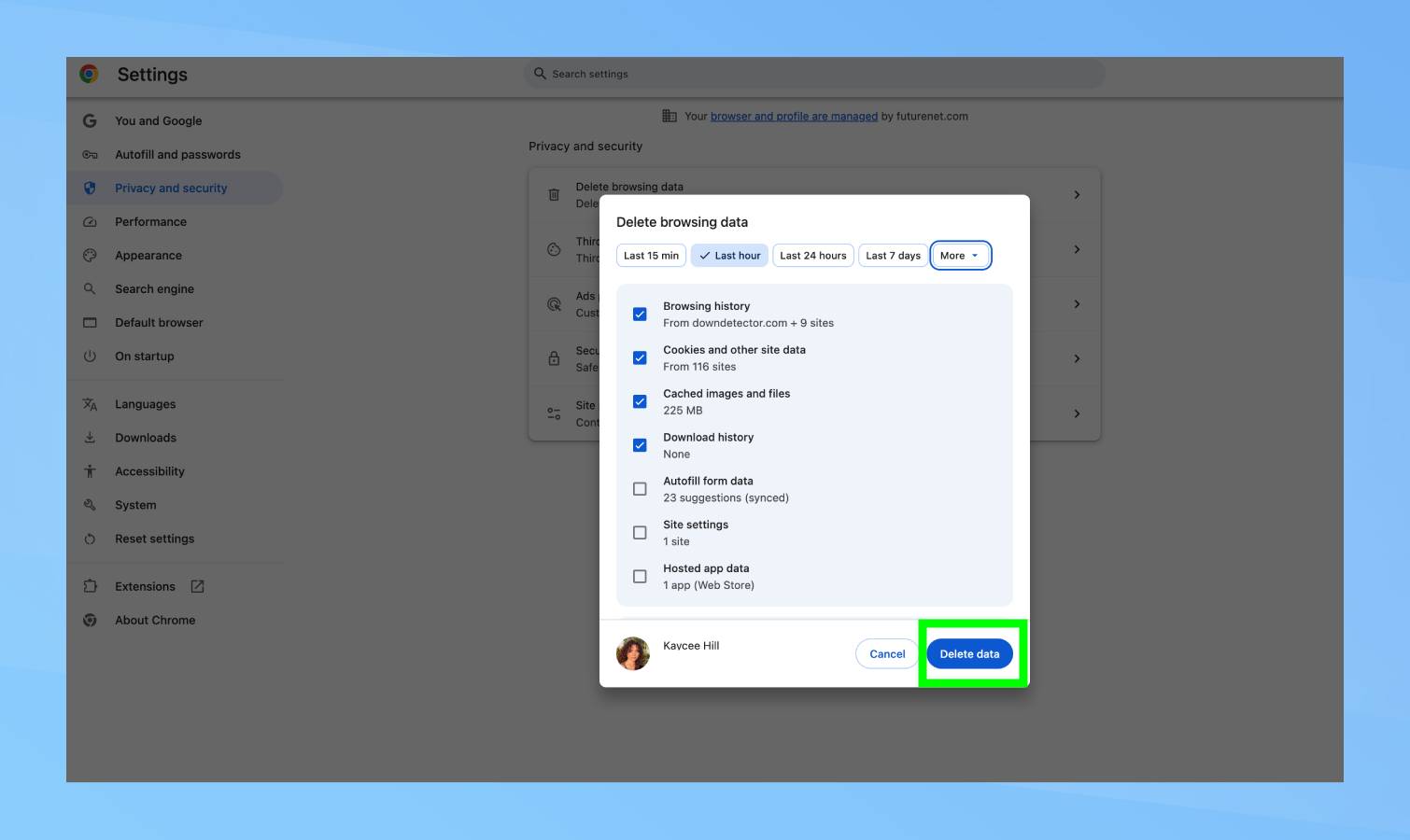 برای انجام این کار، به تنظیمات، حریم خصوصی و امنیت و پاک کردن دادههای مرور بروید.. می توانید انتخاب کنید که داده های خود را از پانزده دقیقه گذشته تا همیشه حذف کنید. سپس به صورت زیر تایید کنید: با کلیک بر روی دکمه آبی “حذف داده ها”. در سمت راست پایین صفحه نمایش.