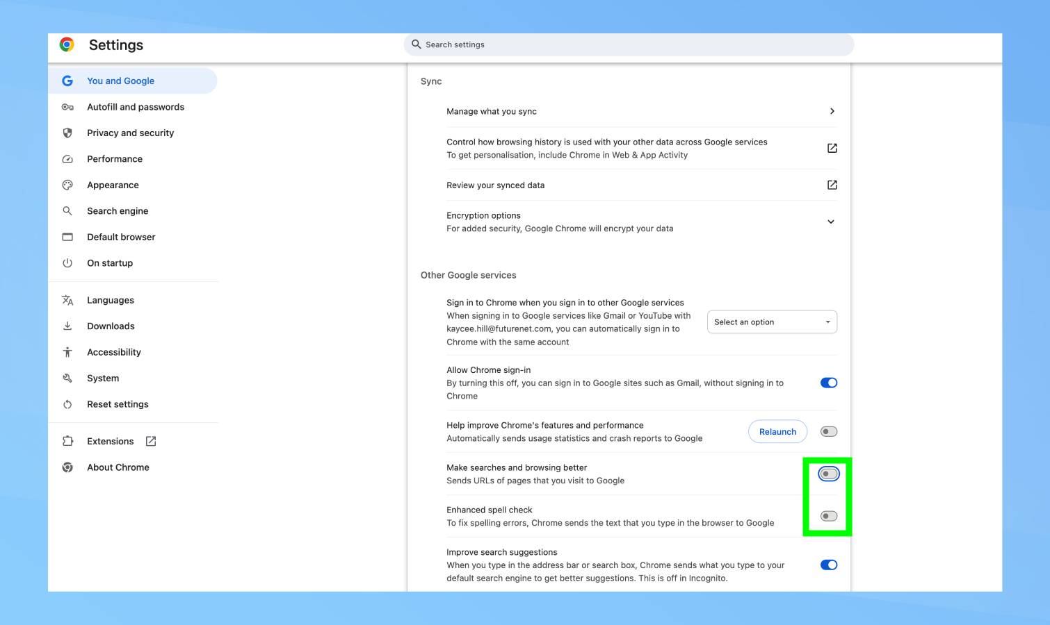 تنظیمات Chrome را با کلیک کردن روی منوی سه نقطه باز کنید و من انتخاب میکنم تنظیمات. زیر شما و گوگلانتخاب کنید همگام سازی و خدمات گوگلو بستن “کمک به بهبود ویژگی ها و عملکرد Chrome” تحت سایر خدمات Google.