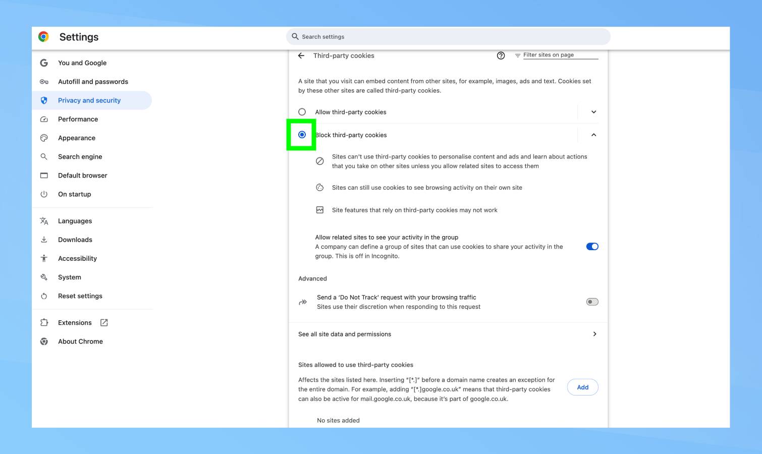 به تنظیمات، حریم خصوصی و امنیت، کوکیهای شخص ثالث بروید و «مسدود کوکیهای شخص ثالث» را روشن کنید. برخی از ویژگی های وب سایت ممکن است خراب شوند، اما بیشتر سایت ها هنوز به درستی کار می کنند.